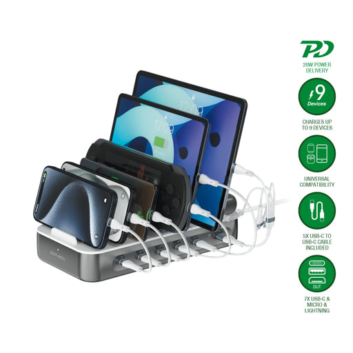 Ein fyrir alla: Hleður allt að níu tæki samtímis - tilvalið fyrir vinnu, heimili eða samkomuhús Snúrusett fylgir með: Fimm USB-C snúrur og ein 4...